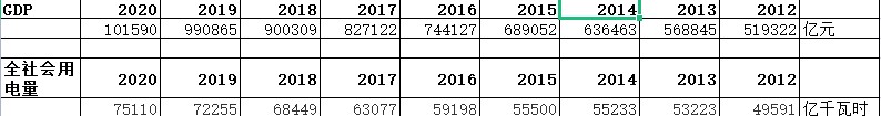 GDP、全社會(huì)用電量2012-2020年(GDP單位:億元,人民幣,全社會(huì)用電量:億千瓦時(shí))