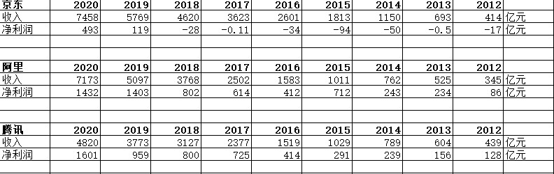 京東、阿里、騰訊2012-2020年?duì)I收、利潤(rùn)(單位:億元,人民幣)