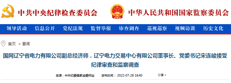 本網訊 中央紀委國家監(jiān)委網站7月28日消息,據(jù)中央紀委國家監(jiān)委駐國家電網有限公司紀檢監(jiān)察組、遼寧省紀委監(jiān)委消息:國網遼寧省電力有限公司副總經濟師,遼寧電力交易中心有限公司董事長、黨委書記宋連峻涉嫌嚴重違紀違法,目前正接受中央紀委國家監(jiān)委駐國家電網有限公司紀檢監(jiān)察組紀律審查和朝陽市監(jiān)察委員會監(jiān)察調查。