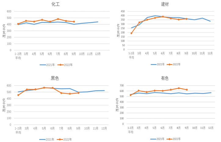 1-9月,化工行業(yè)用電量4065億千瓦時(shí),同比增長(zhǎng)5.1%;建材行業(yè)用電量2960億千瓦時(shí),同比下降4.2%;黑色金屬冶煉行業(yè)用電量4583億千瓦時(shí),同比下降5.3%;有色金屬冶煉行業(yè)用電量5556億千瓦時(shí),同比增長(zhǎng)3.0%。