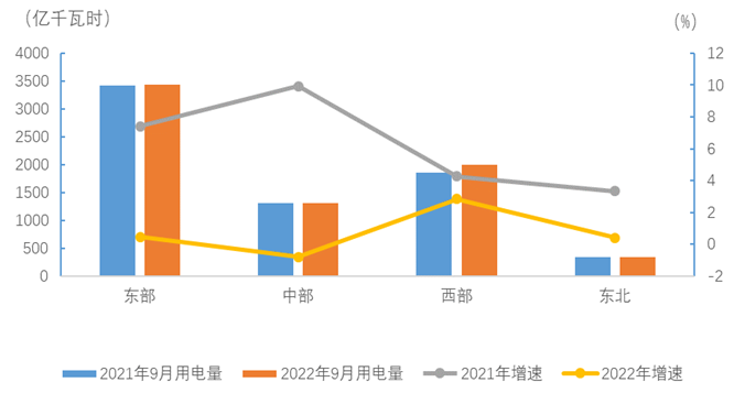 9月份,東、中、西部和東北地區(qū)全社會(huì)用電量增速分別為0.5%、-0.8%、2.9%和0.4%。