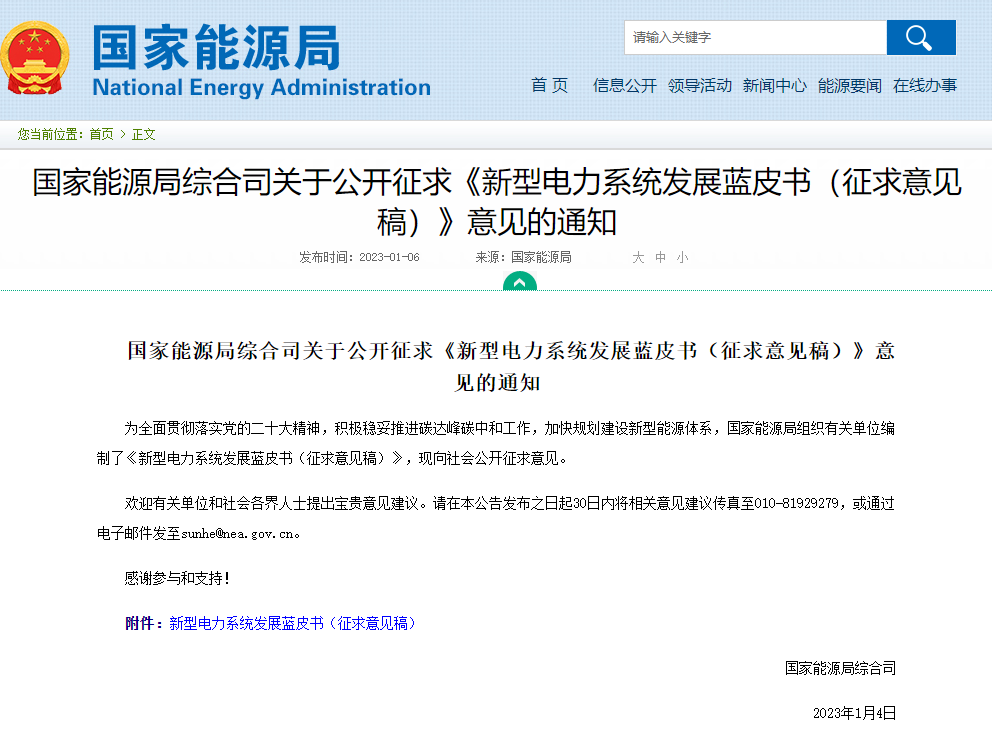國(guó)家能源局綜合司日前發(fā)布關(guān)于公開(kāi)征求《新型電力系統(tǒng)發(fā)展藍(lán)皮書(shū)(征求意見(jiàn)稿)》意見(jiàn)的通知。