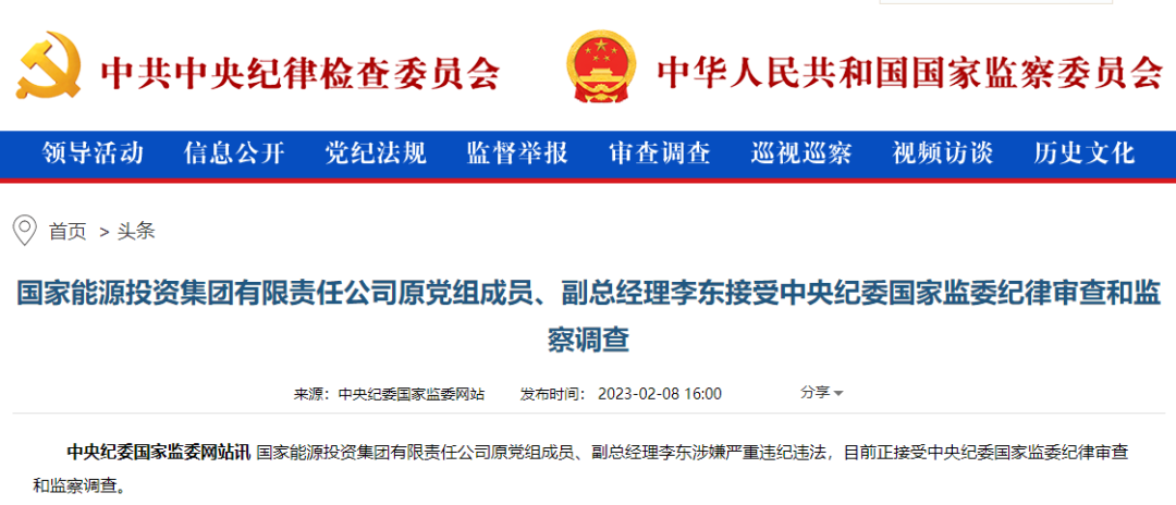 2月8日,據(jù)中央紀(jì)委國家監(jiān)委網(wǎng)站消息,國家能源投資集團有限責(zé)任公司原黨組成員、副總經(jīng)理李東涉嫌嚴(yán)重違紀(jì)違法,目前正接受中央紀(jì)委國家監(jiān)委紀(jì)律審查和監(jiān)察調(diào)查。
