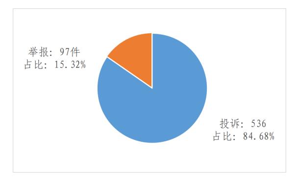 2023年3月,12398熱線共接收投訴舉報(bào)633件,環(huán)比增加21.97%、同比減少23.55%。其中:投訴536件,環(huán)比增加23.79%、同比減少29.93%;舉報(bào)97件,環(huán)比增加12.79%、同比增加53.97%。