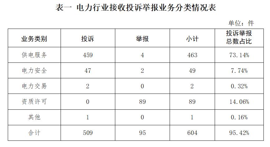 電力行業(yè)排在首位,數(shù)量為604件、占投訴舉報(bào)總數(shù)的95.42%,主要集中在供電服務(wù)、電力安全、電力交易、資質(zhì)許可等方面。(詳見表一)