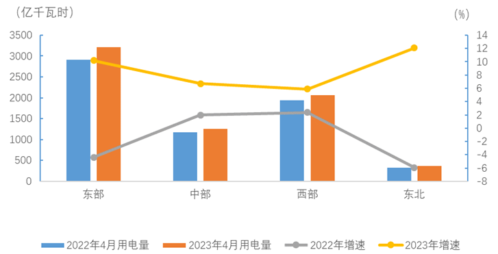 4月份,東、中、西部和東北地區(qū)全社會(huì)用電量增速分別為10.2%、6.7%、5.9%和12.1%。
