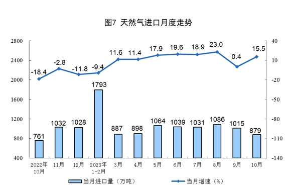 天然氣生產(chǎn)保持平穩(wěn),進(jìn)口增速加快。10月份,生產(chǎn)天然氣190億立方米,同比增長(zhǎng)2.6%,增速比9月份回落6.7個(gè)百分點(diǎn),日均產(chǎn)量6.1億立方米。進(jìn)口天然氣879萬噸,同比增長(zhǎng)15.5%,增速比9月份加快15.1個(gè)百分點(diǎn)。