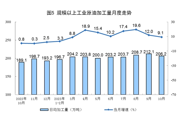 原油加工保持穩(wěn)定增長(zhǎng)。10月份,加工原油6393萬噸,同比增長(zhǎng)9.1%,增速比9月份放緩2.9個(gè)百分點(diǎn),日均加工原油206.2萬噸。1—10月份,加工原油61876萬噸,同比增長(zhǎng)11.2%。