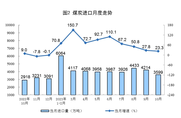 原煤生產(chǎn)增速加快,進(jìn)口較快增長(zhǎng)。10月份,生產(chǎn)原煤3.9億噸,同比增長(zhǎng)3.8%,增速比9月份加快3.4個(gè)百分點(diǎn),日均產(chǎn)量1254.0萬噸。進(jìn)口煤炭3599萬噸,同比增長(zhǎng)23.3%,增速比9月份回落4.5個(gè)百分點(diǎn)。