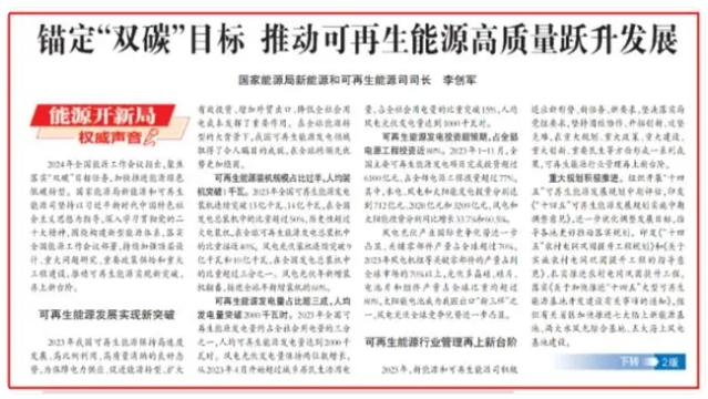 日前,國家能源局新能源和可再生能源司司長李創(chuàng)軍在中國電力報發(fā)表《錨定“雙碳”目標(biāo) 推動可再生能源高質(zhì)量躍升發(fā)展》的文章,總結(jié)了2023年我國能源工作取得的發(fā)展成績,同時就2024年能源工作重點以及政策規(guī)劃方向給出明確指引。