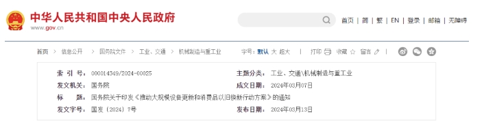 國務院關于印發(fā)《推動大規(guī)模設備更新和消費品以舊換新行動方案》的通知