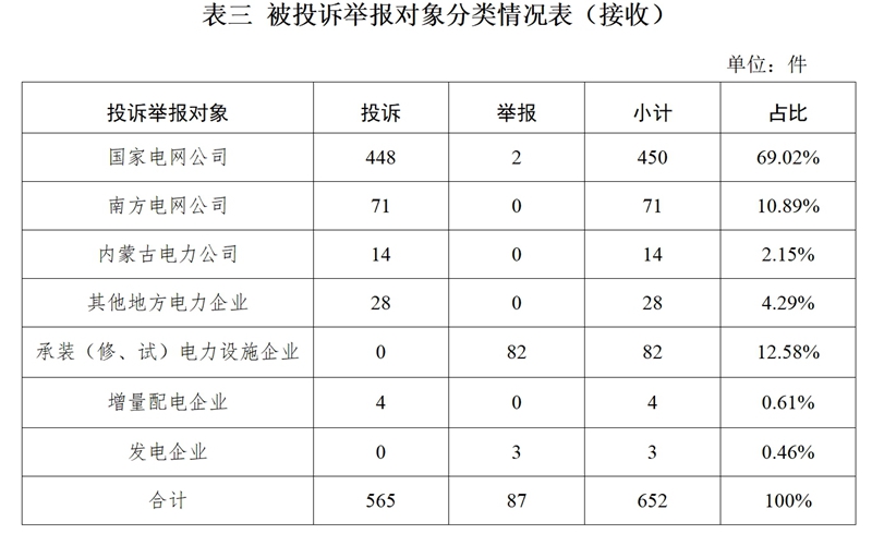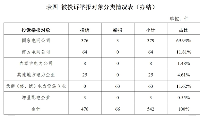 從被投訴舉報(bào)對(duì)象看,供電企業(yè)478件、占投訴舉報(bào)總數(shù)的88.37%,其中:國(guó)家電網(wǎng)公司379件、占比69.93%;南方電網(wǎng)公司64件、占比11.81%;內(nèi)蒙古電力公司8件、占比1.48%;其他地方電力企業(yè)25件、占比4.61%;承裝(修、試)電力設(shè)施企業(yè)63件、占比11.62%;增量配電企業(yè)3件、占比0.55%。