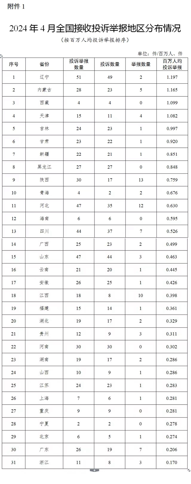附件:1.2024年4月全國(guó)接收投訴舉報(bào)地區(qū)分布情況