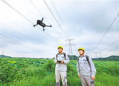 6月20日,在安徽池州,國網(wǎng)安徽電力運維人員運用無人機(jī)巡視特高壓重要輸電通道。