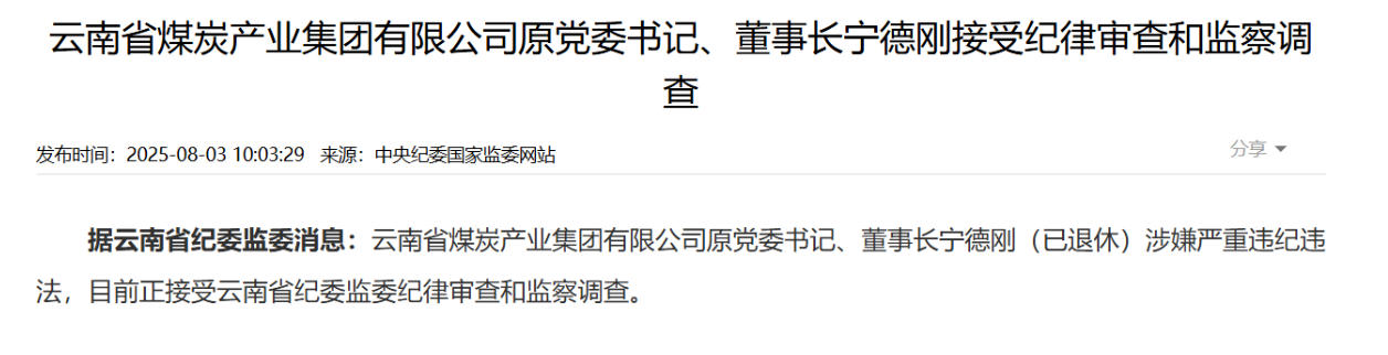 據(jù)云南省紀(jì)委監(jiān)委8月3日消息,云南省煤炭產(chǎn)業(yè)集團(tuán)有限公司原黨委書記、董事長寧德剛(已退休)涉嫌嚴(yán)重違紀(jì)違法,目前正接受審查調(diào)查。