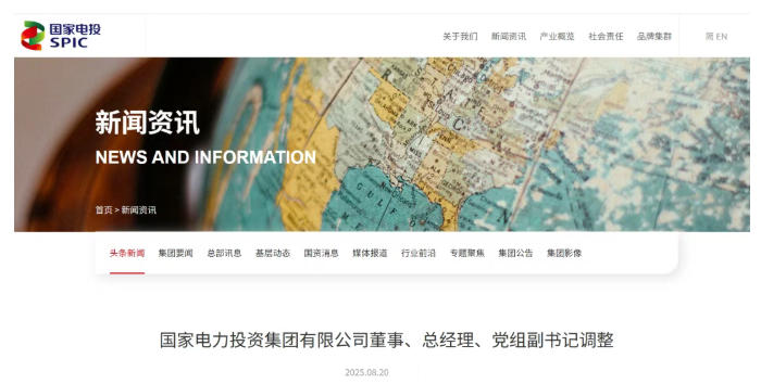 2025年8月20日,國家電力投資集團有限公司召開領導班子(擴大)會議。受中央組織部領導委托,中央組織部有關干部局負責同志宣布了黨中央關于國家電力投資集團有限公司總經(jīng)理調(diào)整的決定: