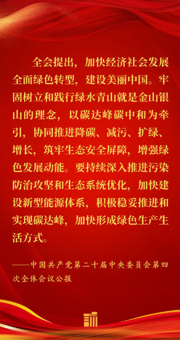 全會提出,加快經(jīng)濟(jì)社會發(fā)展全面綠色轉(zhuǎn)型,建設(shè)美麗中國。牢固樹立和踐行綠水青山就是金山銀山的理念,以碳達(dá)峰碳中和為牽引,協(xié)同推進(jìn)降碳、減污、擴(kuò)綠、增長,筑牢生態(tài)安全屏障,增強(qiáng)綠色發(fā)展動(dòng)能。要持續(xù)深入推進(jìn)污染防治攻堅(jiān)和生態(tài)系統(tǒng)優(yōu)化,加快建設(shè)新型能源體系,積極穩(wěn)妥推進(jìn)和實(shí)現(xiàn)碳達(dá)峰,加快形成綠色生產(chǎn)生活方式。