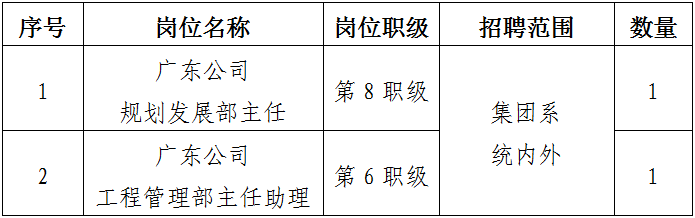 根據(jù)工作需要,依據(jù)公司招聘管理相關(guān)規(guī)定,現(xiàn)對(duì)廣東公司(海外公司)規(guī)劃發(fā)展部主任等兩個(gè)崗位進(jìn)行公開招聘。