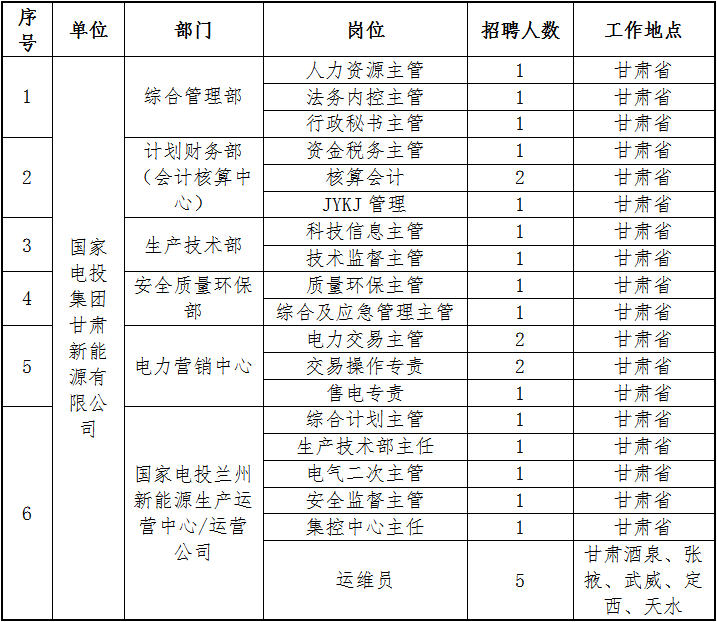 國家電投集團甘肅新能源有限公司(簡稱:國家電投甘肅新能源公司)成立于2016年,是國家電力投資集團有限公司(簡稱:國家電投)在甘肅地區(qū)設立的新能源投資、開發(fā)、建設和運營企業(yè),與國家電投甘肅分公司一體化運作。國家電投甘肅分公司為國家電投二級單位,主要承擔所在地區(qū)區(qū)域規(guī)劃、政府對接、市場開發(fā)、電力營銷、品牌建設等工作。