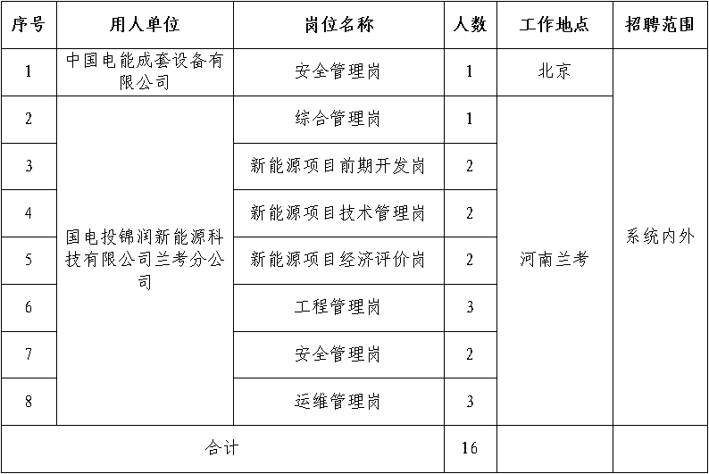 為加快推進公司新興產業(yè)落地,保障各項經(jīng)營管理工作有序開展,根據(jù)相關所屬企業(yè)用人實際,面向國家電投集團系統(tǒng)內、外公開選聘專業(yè)技術人員共16名?,F(xiàn)將有關事項公告如下: