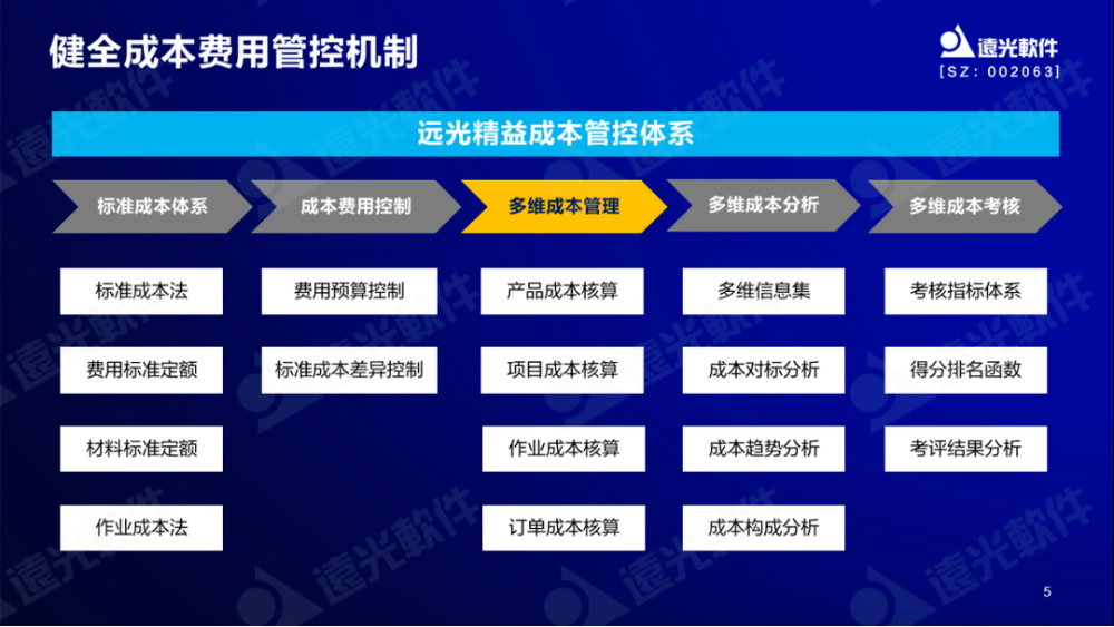 結(jié)合《指導(dǎo)意見》內(nèi)容,谷勇成介紹了遠光精益成本管控體系的產(chǎn)品理念。他指出,遠光精益成本管控體系主要包括“標準成本體系、成本費用控制、多維成本管理、成本分析及成本考核”五大方面,和國資委的《指導(dǎo)意見》要求高度匹配。通過歷史成本、市場價格等參考信息建立企業(yè)標準成本體系,構(gòu)建成本預(yù)測/決策模型;通過成本與費用控制,實現(xiàn)對“料、工、費”發(fā)生過程的全面管控;通過多維成本管理與目標成本管理結(jié)合,進行多維度組合成本歸集、分攤與結(jié)轉(zhuǎn),得出實際成本以與目標(計劃)成本作比較和分析,同時引入同業(yè)對標或國際對標,尋找成本差異及原因;通過標準成本體系及成本定額標準(標準單價*標準業(yè)務(wù)量)的制訂,結(jié)合預(yù)算管理中的控制功能,對各項費用性開支和非生產(chǎn)性支出進行嚴格控制,以聚焦主業(yè)生產(chǎn),提高質(zhì)效;通過考評管理體系、考評指標體系、考評計算函數(shù)、得分計算及排名分析等功能,以實現(xiàn)組織、員工、成本對象等不同維度的考核評價,以激發(fā)企業(yè)和員工活力。