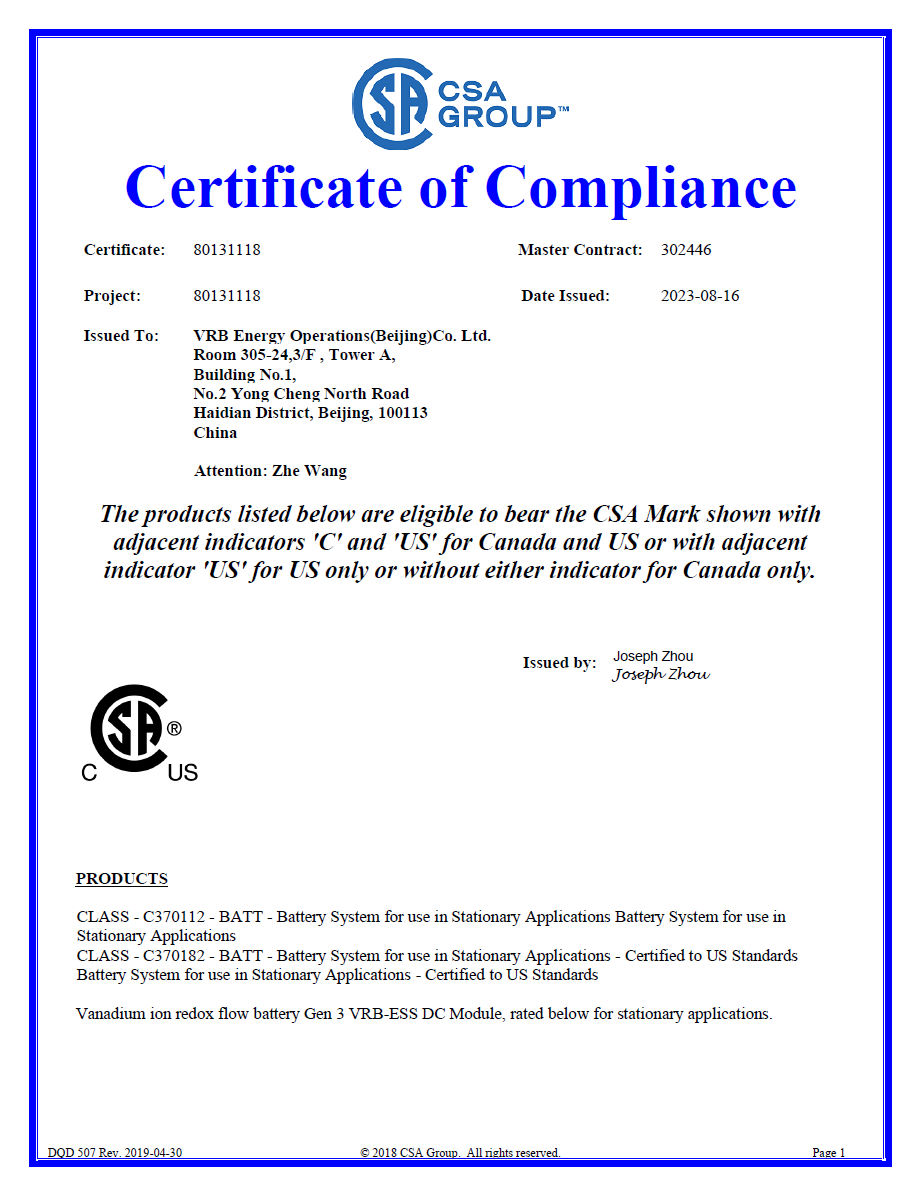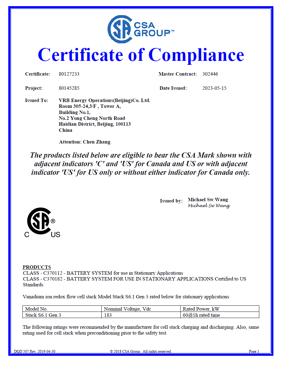 核心部件電堆UL1973認(rèn)證證書(shū)