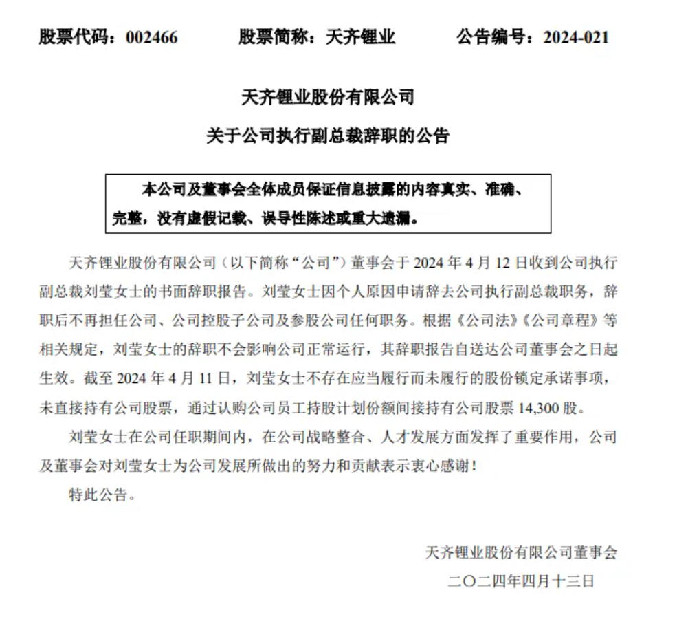 天齊鋰業(yè)發(fā)布公告稱,公司董事會(huì)于4月12日收到公司執(zhí)行副總裁劉瑩女士的書(shū)面辭職報(bào)告。劉瑩女士因個(gè)人原因申請(qǐng)辭去公司執(zhí)行副總裁職務(wù) ,辭職后不再擔(dān)任公司、公司控股子公司及參股公司任何職務(wù)。根據(jù)《公司法》《公司章程》等相關(guān)規(guī)定,劉瑩女士的辭職不會(huì)影響公司正常運(yùn)行,其辭職報(bào)告自送達(dá)公司董事會(huì)之日起生效。