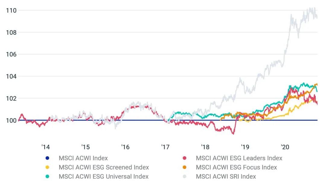 圖:相對基準的MSCI ACWI ESG指數(shù)系列表現(xiàn)