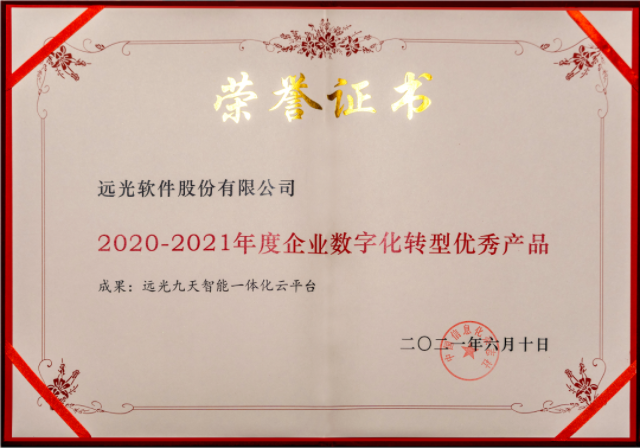 憑借強大的技術(shù)能力、協(xié)同創(chuàng)新能力和潛在應(yīng)用價值,遠光九天平臺獲得了大會組委、活動評審和眾多企業(yè)、客戶的一致認可,獲選“2020-2021年度企業(yè)數(shù)字化轉(zhuǎn)型優(yōu)秀產(chǎn)品”。
