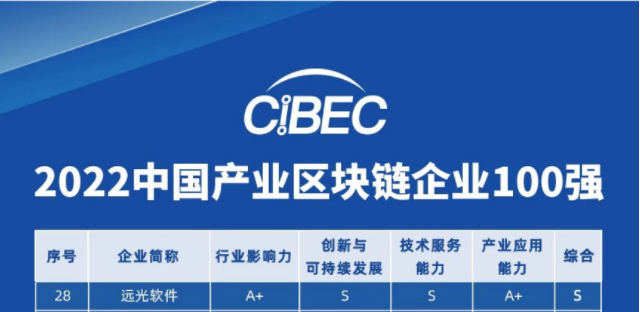大會根據(jù)該調(diào)研結(jié)果發(fā)布了“2022中國產(chǎn)業(yè)區(qū)塊鏈企業(yè)100強”榜單。榜單評選基于調(diào)研企業(yè)2021年度全年相關(guān)數(shù)據(jù)統(tǒng)計分析與核查比對得出,評選指標由行業(yè)影響力、創(chuàng)新與可持續(xù)發(fā)展、技術(shù)服務(wù)能力、產(chǎn)業(yè)應(yīng)用能力四個一級指標,19個細化統(tǒng)計指標構(gòu)成。遠光軟件從眾多候選企業(yè)中脫穎而出,以S級評分入選百強企業(yè)前列。