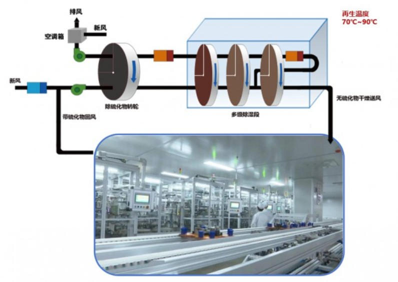 生產(chǎn)車間中濃度較低的H?S 氣體,會被除濕系統(tǒng)的負壓回風帶入除濕機內(nèi)部。該除濕機裝有活性炭過濾器/除硫轉(zhuǎn)輪,可先吸附硫化氫,再進行除濕。