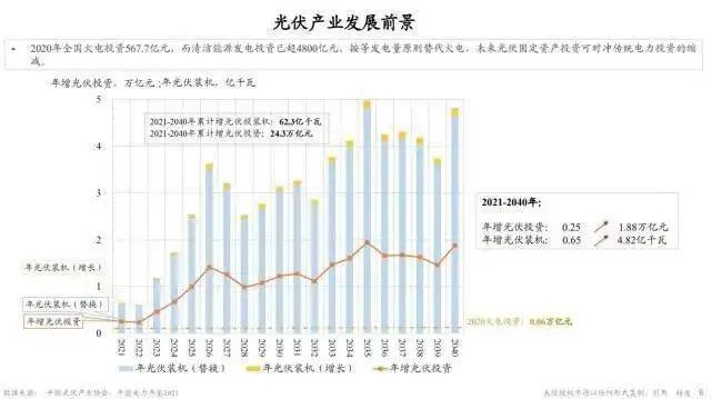 按照剛才的演進路徑,光伏產業(yè)投資假如從2021年開始,新增的電源都是由光伏裝機來實現,那么下面這張圖就展示了未來的20年的一個投資逐漸增加的過程,從開始大概0.25萬億,到后來大概2萬億的年投資,整個全過程完成約20年,總共的投資規(guī)模大概是20多萬億元。