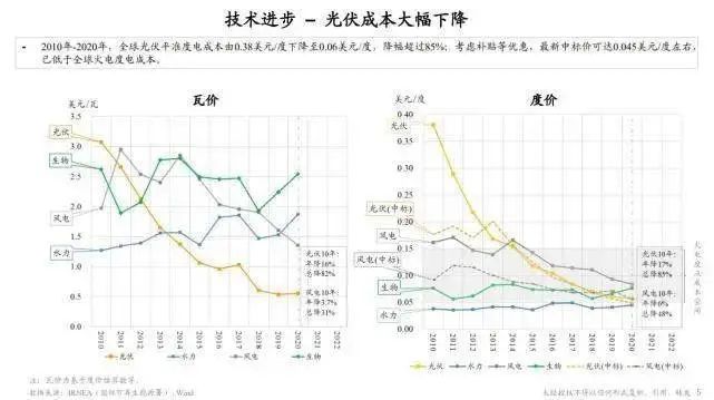再看新優(yōu)勢,就是技術進步使得光伏成本大幅下降。在過去的十年,光伏的度電價格降幅超過85%。左圖中每瓦的光伏裝機的價格有一個很大的降幅,然后看右圖中光伏每度電的價格也有了大幅度下降,這也是在幾種不同的可再生能源類別中成本降幅最快的,這樣的話就大大提升了光伏的經濟可行性。