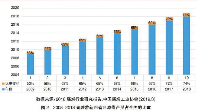 在供給側(cè)結(jié)構(gòu)性改革政策的推動下,煤炭產(chǎn)能集中度進一步提高。十八大以來,國務(wù)院相繼出臺了關(guān)于深化煤炭市場化改革的一系列文件,增大了煤炭去產(chǎn)能力度,截至到2018年底,基本上提前完成了“十三五”煤炭去產(chǎn)能8億噸的計劃,淘汰關(guān)閉了一大批不合標(biāo)準(zhǔn)的煤礦。同時,為了滿足日益增長的能源市場需要,新建、擴建、技改一批現(xiàn)代化礦井,產(chǎn)能已達(dá)到14.96億噸。據(jù)中國煤炭工業(yè)協(xié)會統(tǒng)計,全國煤礦數(shù)量從2015年的1.08萬處減少到目前的5800處,年產(chǎn)能120萬噸及以上的大型煤礦產(chǎn)量超過80%,年產(chǎn)能30萬噸及以下小型煤礦減少至10%以下。煤炭開采向大型煤炭基地集中,其產(chǎn)量占全國總產(chǎn)量的95%以上,5000萬噸級以上大型礦井產(chǎn)量占60%以上。煤炭生產(chǎn)布局進一步向晉、陜、蒙、新地區(qū)等地區(qū)集中。2018年,內(nèi)蒙古、山西、陜西、新疆、貴州、山東、河南、安徽等8個億噸級規(guī)模以上企業(yè)原煤產(chǎn)量達(dá)31.2億噸,占全國的88.1%,其中,晉、陜、蒙、新四省(區(qū))原煤產(chǎn)量占全國的74.3%。見圖1、圖2。