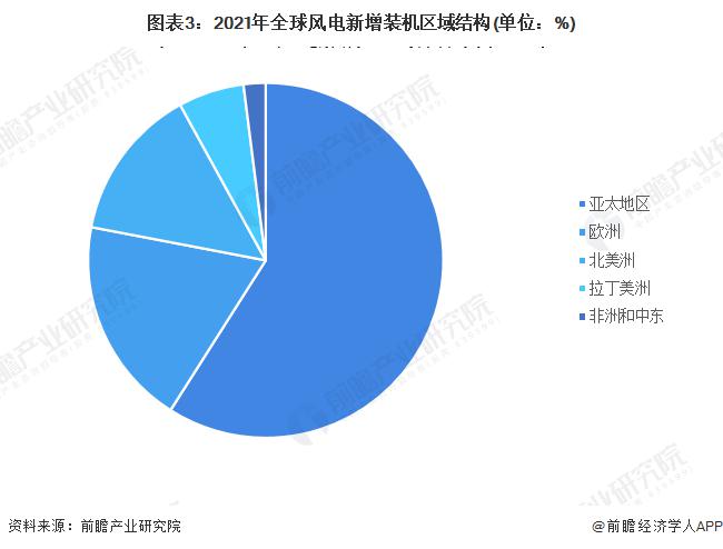 2021 年,亞太地區(qū)新增風(fēng)電裝機(jī)容量占全球新增裝機(jī)容量的比重達(dá)到了 59%,再次成為全球風(fēng)電增長(zhǎng)引擎 ; 歐洲和北美洲新增風(fēng)電裝機(jī)容量占比分別為 19% 和 14%; 拉丁美洲占比 6%; 非洲和中東占比僅為 2%。