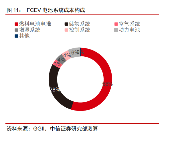 可見,燃料電池系統(tǒng)是氫能車成本構(gòu)成占比最大的一部分,因此未來如果燃料電池電堆成本能夠不斷下降,對燃料電池車的降本也有積極效果。