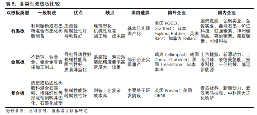 雙極板(BP):依材質(zhì)可分為石墨雙極板、金屬雙極板和復(fù)合雙極板。氫燃料電池目前主要采用石墨板或金屬板,釩液流電池傾向復(fù)合板。國(guó)產(chǎn)化進(jìn)程方面,石墨板基本已實(shí)現(xiàn)國(guó)產(chǎn)化,金屬板已有部分企業(yè)實(shí)現(xiàn)量產(chǎn),復(fù)合板尚處研發(fā)階段。