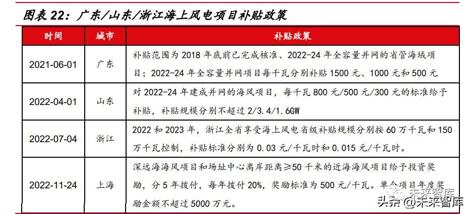 2014-2021 年,海上風(fēng)電建設(shè)享有國(guó)家補(bǔ)貼,沿海地區(qū)含稅燃煤電價(jià)為 0.37- 0.46 元/度電,而海上風(fēng)電近海項(xiàng)目補(bǔ)貼后的上網(wǎng)電價(jià)在 0.75-0.85 元/度電,高額補(bǔ)貼過(guò)去助推了我國(guó)海上風(fēng)電快速發(fā)展。2022 年起國(guó)家補(bǔ)貼退坡,開(kāi)發(fā)商建設(shè)意 愿減弱。我們認(rèn)為國(guó)補(bǔ)退出后,我國(guó)海上風(fēng)電主要通過(guò) 1)產(chǎn)業(yè)鏈降本;2)地方 補(bǔ)貼支持實(shí)現(xiàn)平價(jià)并提升項(xiàng)目性價(jià)比。