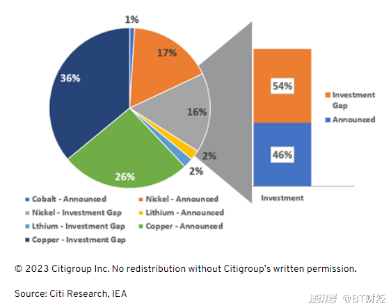 根據(jù)國(guó)際能源署(IEA)的數(shù)據(jù),關(guān)鍵礦產(chǎn)所需的投資在3600億至4500億美元之間??紤]到已宣布的項(xiàng)目,目前的投資缺口為54%,即1940億美元至2430億美元。目前,投資缺口最大的礦產(chǎn)是銅,占36%,其次是鎳,占16%。