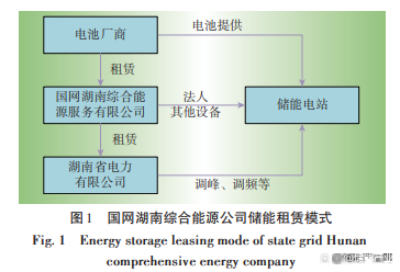 在工商業(yè)用戶市場(chǎng),美國(guó)的AMS公司向用戶提供儲(chǔ)能租賃服務(wù)以幫助用戶節(jié)省電費(fèi)支出。針對(duì)新能源消納空間不足以及新能源發(fā)電企業(yè)自配儲(chǔ)能困難的問題,國(guó)網(wǎng)湖南綜合能源公司于2020年11月發(fā)布儲(chǔ)能設(shè)備租賃招標(biāo)公告,首創(chuàng)電池租賃模式,該運(yùn)營(yíng)模式如圖1所示。