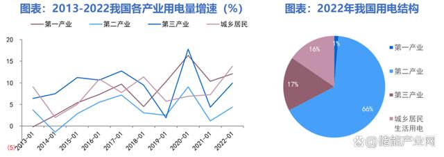 第三產(chǎn)業(yè)和居民用電增速快于工業(yè),負(fù)荷峰值增速大于用電量增速。近十年以來,我國第二產(chǎn)業(yè)增速相對較低,在用電結(jié)構(gòu)占比明顯降低,從2013年的73%下降至2022年的66%,第三產(chǎn)業(yè)和城鄉(xiāng)居民生活用電占比之和則由2013年的25%提高至2022年的33%。