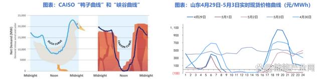 國內(nèi)以山東為代表的部分省份同樣有明顯的填谷需求。山東裝機結(jié)構(gòu)與CAISO相似,截至22年底,光伏裝機占比達(dá)到22.5%。在2023年五一假期期間,山東省內(nèi)用電負(fù)荷下降約15%,引發(fā)連續(xù)負(fù)電價現(xiàn)象。值得注意的是,4月29日-5月1日現(xiàn)貨價格曲線形狀類似鴨子曲線,期間10時-15時負(fù)電價出現(xiàn)尤為頻繁,而該時段為光伏發(fā)電高峰。