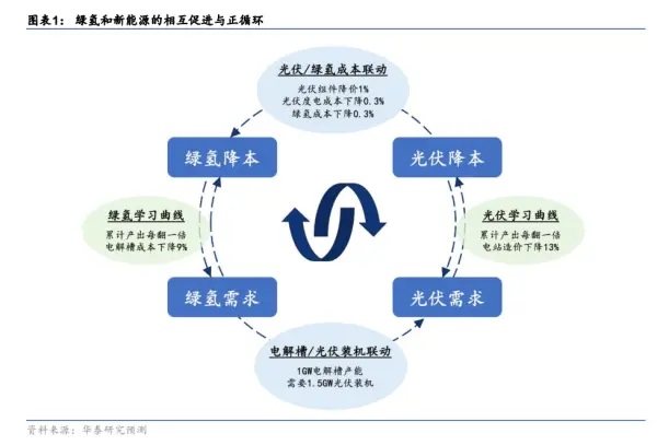 華泰證券最近有篇報(bào)告,畫(huà)了一張光伏和綠氫成本聯(lián)動(dòng)的圖。核心的意思就是光伏降本遵循摩爾定律,而綠氫由光伏電解水制成,光伏降本會(huì)帶來(lái)綠氫成本的不斷下降,隨著綠氫成本的下降,就會(huì)解鎖越來(lái)越多的應(yīng)用,反過(guò)來(lái)又會(huì)帶動(dòng)光伏的需求。這是一個(gè)循環(huán)。