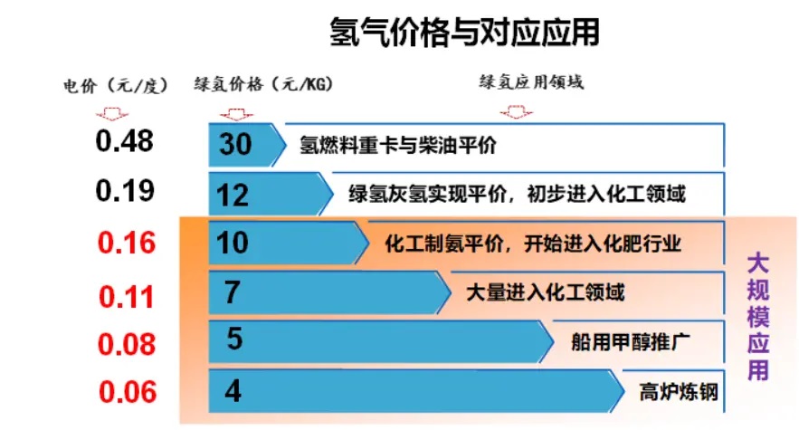 當(dāng)光伏電價(jià)降到0.19元每度時(shí),對(duì)應(yīng)的綠氫價(jià)格是12元每公斤,這個(gè)時(shí)候的綠氫價(jià)格跟最便宜的煤制氫價(jià)格打平,一些單獨(dú)需要?dú)錃獾幕ち鞒蹋梢赃x擇綠氫,雖然整體應(yīng)用并不多。
