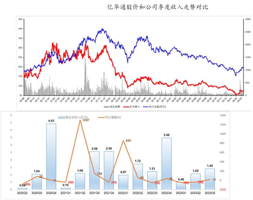 說(shuō)到股價(jià),讓我們先看億華通,這個(gè)燃料電池系統(tǒng)的龍頭。自2020年上市之后,公司的收入雖然增速一般,但還是跟著電力設(shè)備行業(yè)漲了很長(zhǎng)一段時(shí)間,一直到2022年初見(jiàn)頂,然后就是隨著行業(yè),股價(jià)一路向下。當(dāng)然從收入增速上看,2022、2023兩年,收入同比增速顯然是下臺(tái)階的。原因就是雖然燃料電池系統(tǒng)的銷量是漲的,但是架不住單價(jià)下的太快,2020年單KW還能有個(gè)1.5-2萬(wàn),到了2023年就只有3000,這個(gè)降幅顯然太快了。
