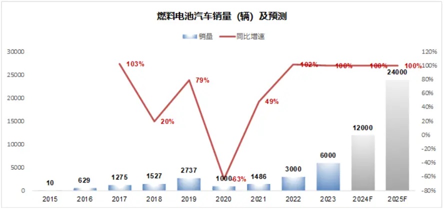 假如到2025年完成5萬(wàn)輛的保有量,未來(lái)兩年需要燃料電池汽車銷量翻倍,2024年1.2萬(wàn)輛,2025年2.4萬(wàn)輛。市場(chǎng)上很多人質(zhì)疑這個(gè)目標(biāo)是不是能完成。