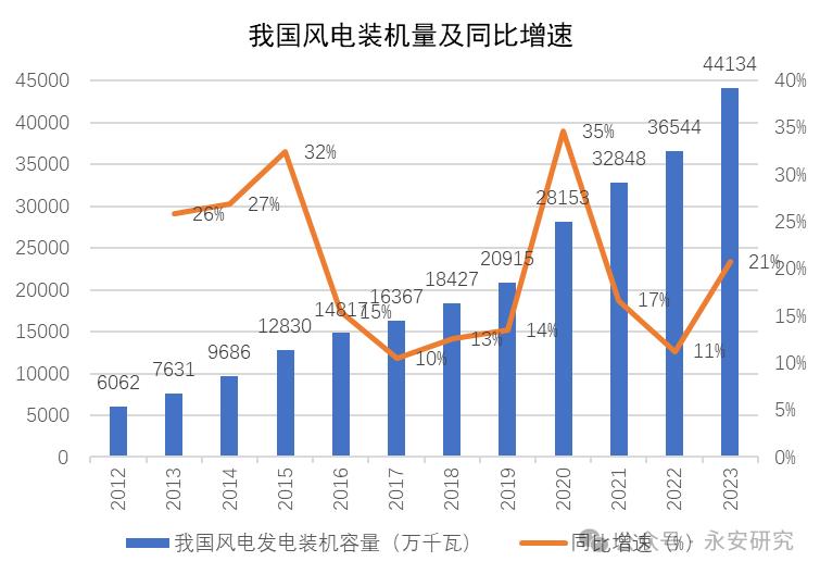 圖2、我國風(fēng)電裝機(jī)量及同比增速
