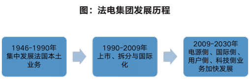 受到二戰(zhàn)后重建、石油危機的影響,法國政府希望在短時間內快速建設法國電力工業(yè)。政府要求法電集團作為擔當此重任的主體。于是此階段法電重點發(fā)展本土的發(fā)電、輸電、配電業(yè)務,尤其是大量建設核電站。