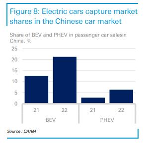 去年,電動汽車在中國的市場份額繼續(xù)擴大。純電動汽車在乘用車總銷量中的份額從2021年的12.7%擴大到2022年的21.3%,而插電式混合動力汽車的市場份額從2.8%增加到6.4%,增長了一倍多。