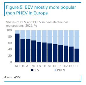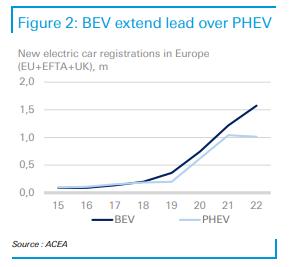 盡管近年來歐洲新車總注冊量有所下降,但電動汽車的新注冊量卻穩(wěn)步上升。 2022年,歐洲新注冊的電動汽車不到260萬輛,同比增長14.6%,其中包括近160萬輛純電動汽車(BEV)和100萬輛插電式混合動力車(PHEV)。 這也使電動汽車在2022年新乘用車總注冊量中的份額增加到22.9%,2021年為19.2%。